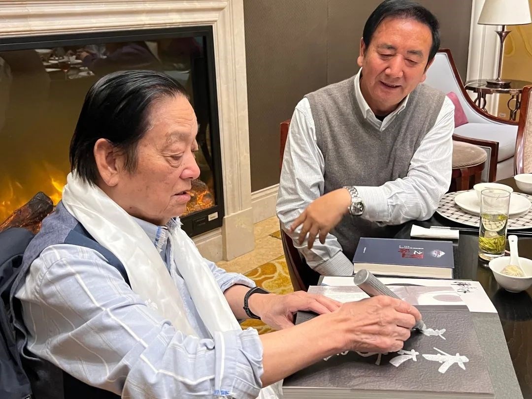▲韓美林為原青海省第十二屆人大常委會黨組副書記,現(xiàn)三江源生態(tài)保護(hù)基金會理事長鄧本太簽書留念