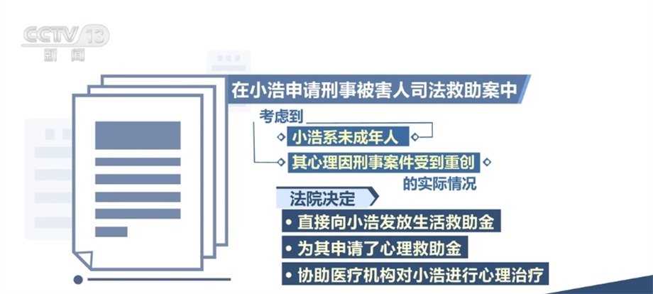 在此次發(fā)布的保護(hù)未成年人權(quán)益司法救助典型案例中,還涉及針對(duì)向未成年人提供專門心理救助金、提供心理危機(jī)干預(yù)等立體幫扶,進(jìn)一步延伸司法服務(wù)。在小浩申請(qǐng)刑事被害人司法救助案中,小浩的父親被害,其本人亦受到人身傷害,法院作出刑事附帶民事判決,判處被告人死刑,并判決其賠償附帶民事訴訟原告人經(jīng)濟(jì)損失13萬余元。后經(jīng)調(diào)查,被告人無財(cái)產(chǎn)可供執(zhí)行。考慮到小浩系未成年人,其心理因刑事案件受到重創(chuàng)的實(shí)際情況,法院除決定直接向小浩發(fā)放生活救助金外,還為其申請(qǐng)了心理救助金,協(xié)助醫(yī)療機(jī)構(gòu)對(duì)小浩進(jìn)行心理治療。