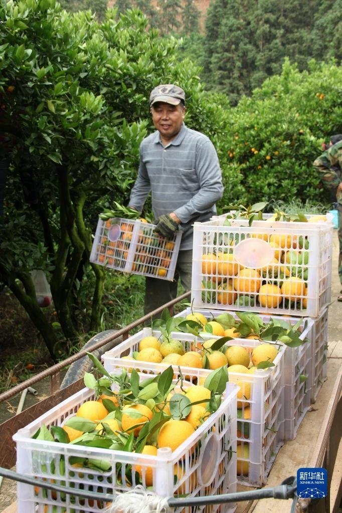 5月25日,在福建省南平市順昌縣雙溪街道陳布村的一家夏橙種植園,果農(nóng)在采摘夏橙。