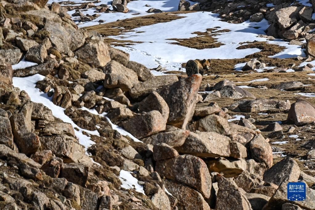 一頭藏馬熊在阿爾金山國家級自然保護(hù)區(qū)覓食(5月23日攝)。