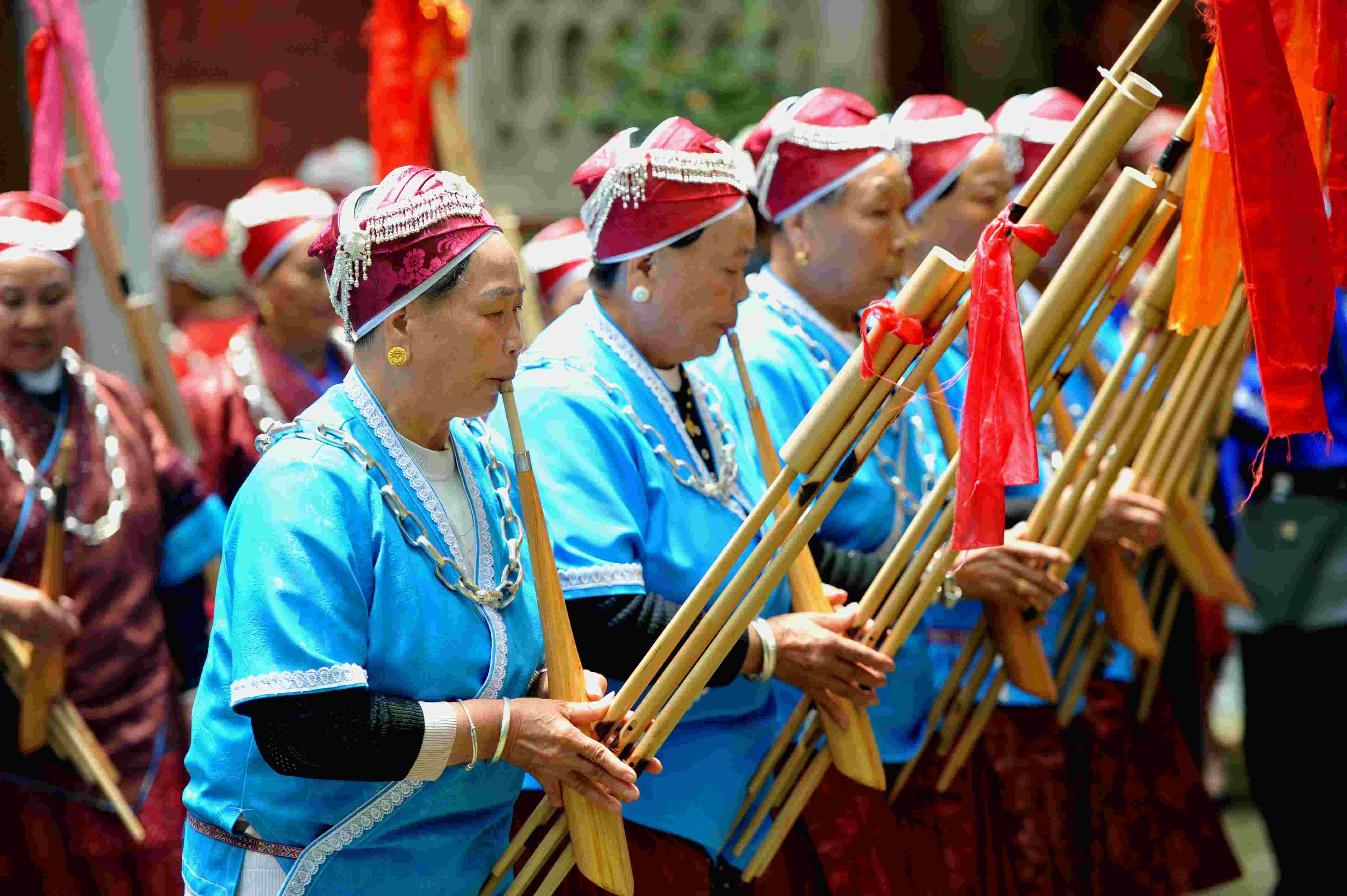 2023年5月26日,苗族同胞在貴州省黃平縣飛云崖景區(qū)吹奏蘆笙。 (寧堅 楊忠)