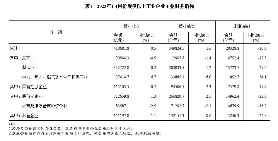 央視網(wǎng)消息:據(jù)國家統(tǒng)計局網(wǎng)站消息,1—4月份,全國規(guī)模以上工業(yè)企業(yè)實現(xiàn)利潤總額20328.8億元,同比下降20.6%(按可比口徑計算,詳見附注二)。