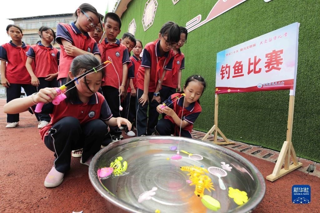 5月30日,貴州省錦屏縣城關(guān)第三小學學生在參加釣魚比賽。 新華社發(fā)(楊曉海攝)