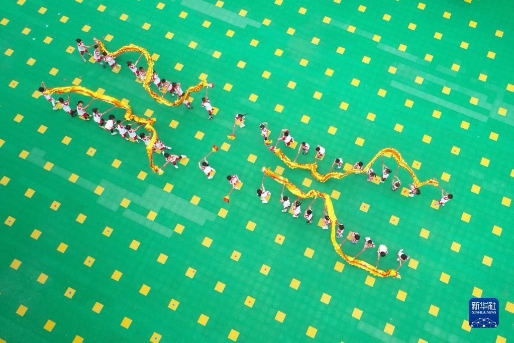 5月30日,在河北省唐山市豐潤區(qū)左家塢鎮(zhèn)中心幼兒園,孩子們在表演舞龍節(jié)目(無人機照片)。 新華社發(fā)(朱大勇攝)