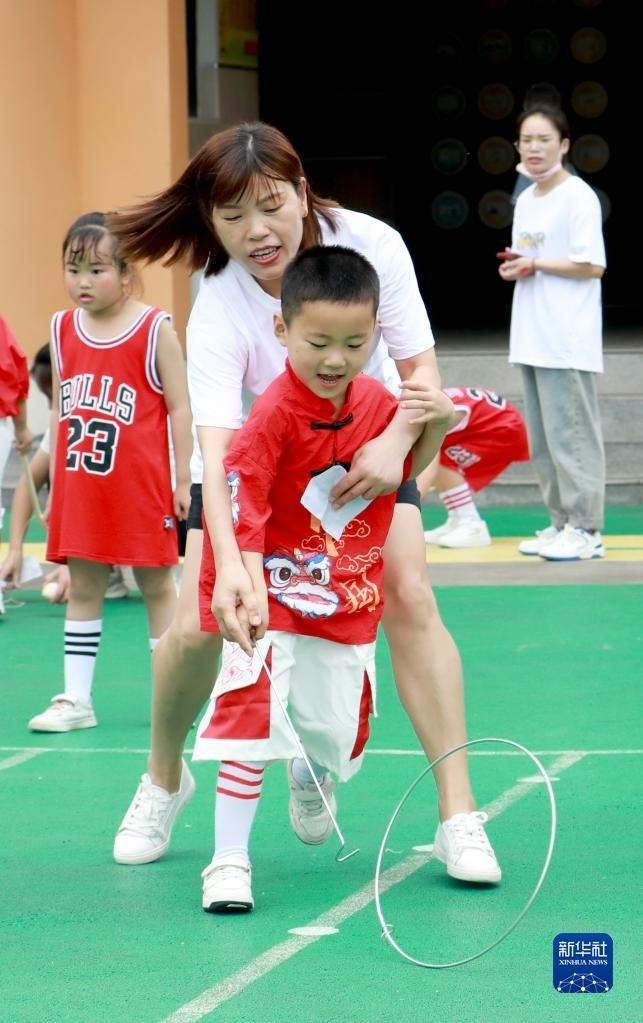 5月30日,在四川省華鎣市杜家坪幼兒園,家長和孩子在一起參加滾鐵環(huán)游戲。 新華社發(fā)(周松林攝)