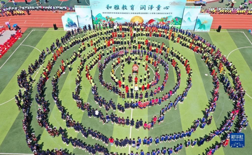 5月30日,在廣西桂林市龍勝各族自治縣龍勝鎮(zhèn)第二小學,師生在跳團圓舞(無人機照片)。 新華社發(fā)(潘志祥攝)