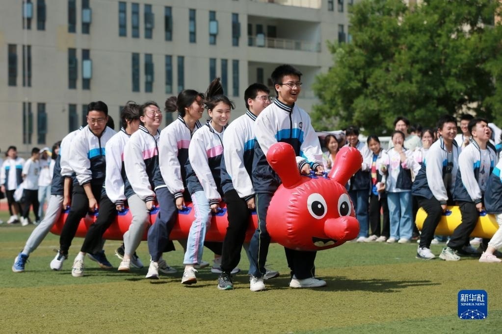 高考臨近,安徽省淮北市第十二中學(xué)組織高三年級(jí)學(xué)生開展豐富多彩的集體減壓活動(dòng),讓學(xué)生們?cè)谌の队螒蛑嗅尫艍毫Γ暂p松、樂觀、自信的心態(tài)迎接高考。新華社發(fā)(萬(wàn)善朝 攝)