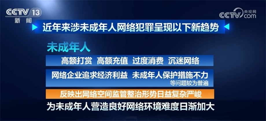 據(jù)最高檢相關(guān)部門負(fù)責(zé)人介紹,近年來涉未成年人網(wǎng)絡(luò)犯罪呈現(xiàn)以下新趨勢:未成年人觸網(wǎng)低齡化日趨明顯,更易遭受網(wǎng)絡(luò)不法侵害;利用網(wǎng)絡(luò)侵害未成年人犯罪手段復(fù)雜多樣,方式不斷翻新,“網(wǎng)絡(luò)誘騙”“隔空猥褻”等新類型犯罪隱蔽性強、打擊難度大;一些未成年人通過網(wǎng)絡(luò)接觸暴力、色情、毒品、低俗等不良信息,導(dǎo)致形成不健康價值觀,甚至盲目跟風(fēng)、走向違法犯罪;未成年人高額打賞、高額充值、過度消費、沉迷網(wǎng)絡(luò),網(wǎng)絡(luò)企業(yè)追求經(jīng)濟(jì)利益、未成年人保護(hù)措施不力等問題較為普遍,反映出網(wǎng)絡(luò)空間監(jiān)管整治形勢日益復(fù)雜嚴(yán)峻,為未成年人營造良好網(wǎng)絡(luò)環(huán)境難度日漸加大。