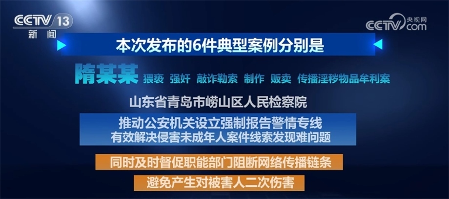 隋某某猥褻、強奸、敲詐勒索、制作、販賣、傳播淫穢物品牟利案。山東省青島市嶗山區(qū)人民檢察院推動公安機關(guān)設(shè)立強制報告警情專線,有效解決侵害未成年人案件線索發(fā)現(xiàn)難問題。同時,及時督促職能部門阻斷網(wǎng)絡(luò)傳播鏈條,避免產(chǎn)生對被害人二次傷害。