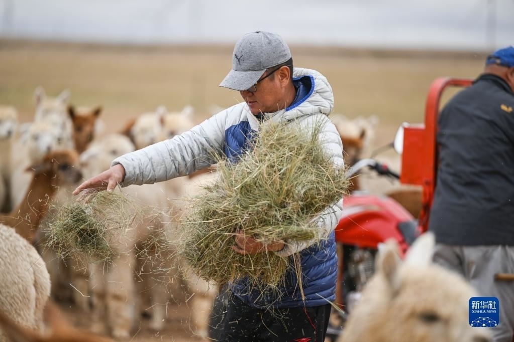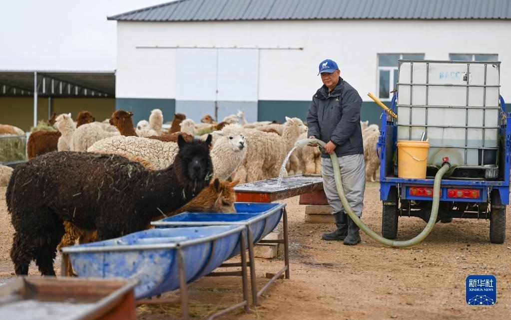 6月1日,巴彥杭蓋嘎查羊駝養(yǎng)殖基地的工作人員準(zhǔn)備給羊駝喂食。