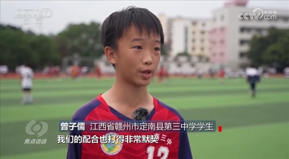 江西省贛州市定南縣第三中學(xué)學(xué)生曾子儒:“踢足球之前自己體弱多病,身體素質(zhì)比較差,別提去踢這么一場激烈的足球比賽,就是讓我圍著操場跑一圈都?xì)獯跤?。?br>
