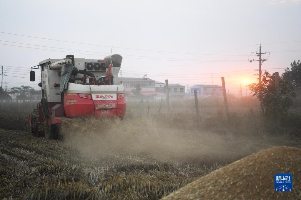 6月1日,在河南省駐馬店市上蔡縣邵店鎮(zhèn)劉岳村,收割機在搶收小麥。新華社記者 張浩然 攝