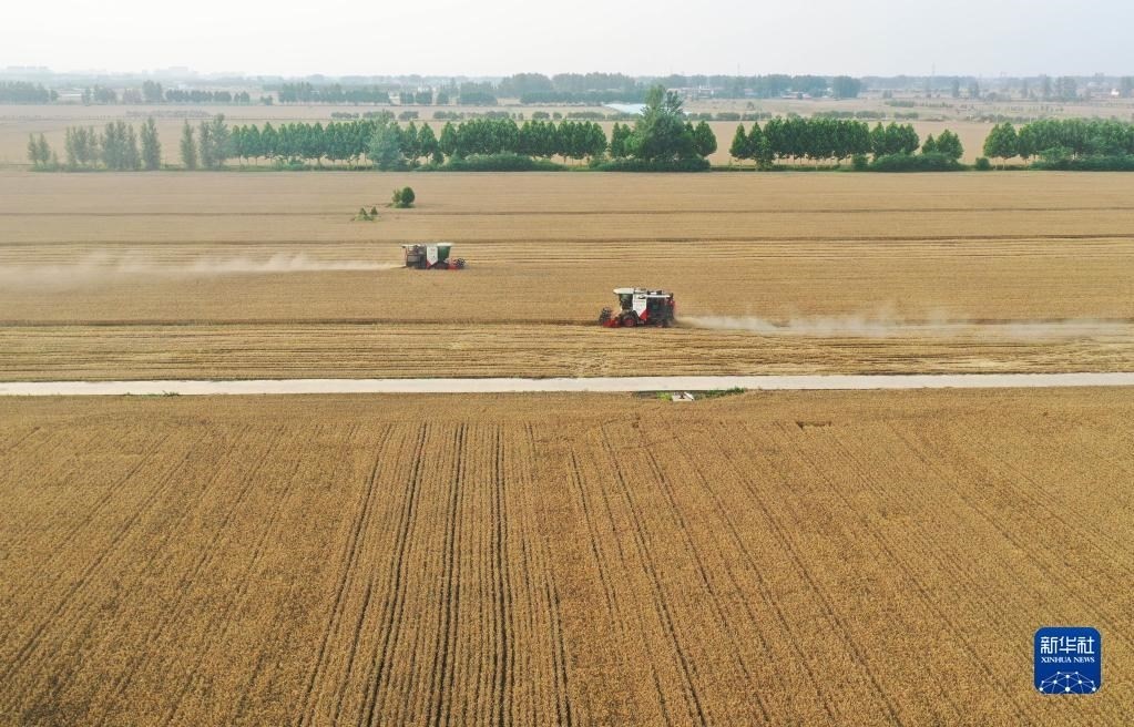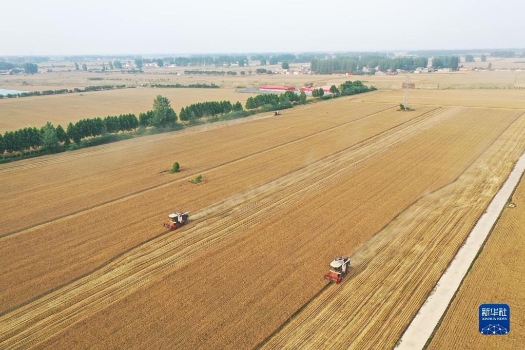 6月1日,在河南省駐馬店市上蔡縣邵店鎮(zhèn)后楊村,收割機在搶收小麥(無人機照片)。新華社記者 張浩然 攝