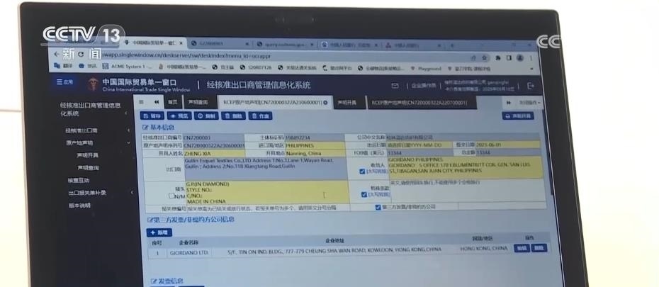 當日,廣西桂林一家紡織企業(yè)通過國際貿(mào)易“單一窗口”申報,為一批出口到菲律賓的貨物自主出具了廣西首份RCEP原產(chǎn)地聲明,貨值約9萬元,在菲律賓享受關(guān)稅優(yōu)惠約1.3萬元。2022年,這家紡織企業(yè)作為海關(guān)高級認證企業(yè),率先認證成為廣西紡織領(lǐng)域首家“經(jīng)核準出口商”。