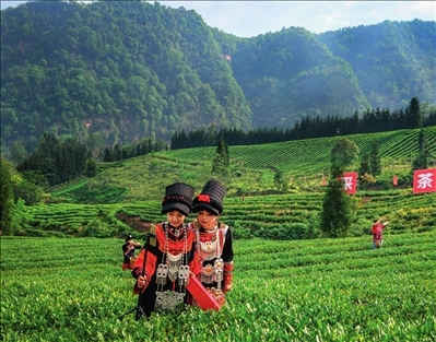四川省小涼山地區(qū)的樂山市馬邊彝族自治縣福來(lái)村,身著傳統(tǒng)彝族服飾的工作人員用手機(jī)直播采茶(2022 年 4月 27 日攝)唐文豪攝 / 本刊