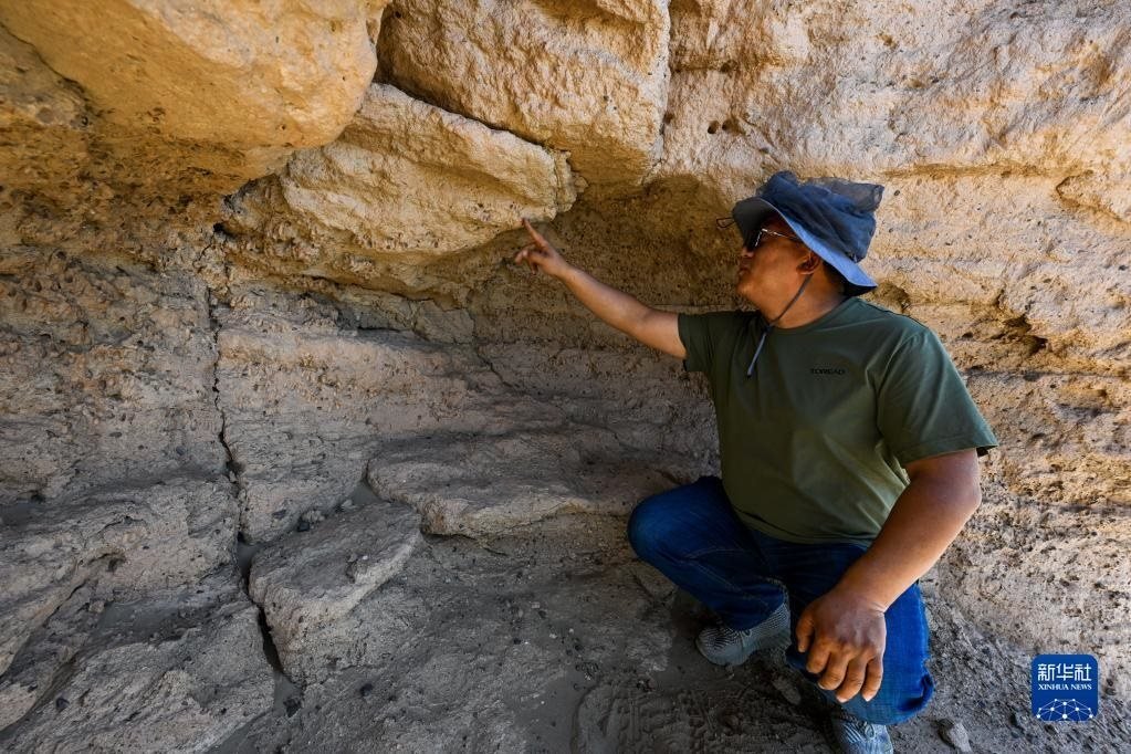 6月2日,額濟(jì)納旗文物保護(hù)中心工作人員在查看一處墓葬封土堆。