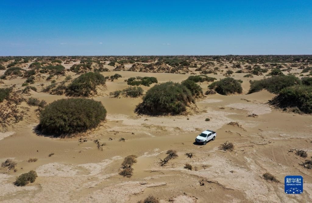 6月2日,額濟(jì)納旗文物保護(hù)中心工作人員在戈壁灘上巡護(hù)(無人機(jī)照片)。