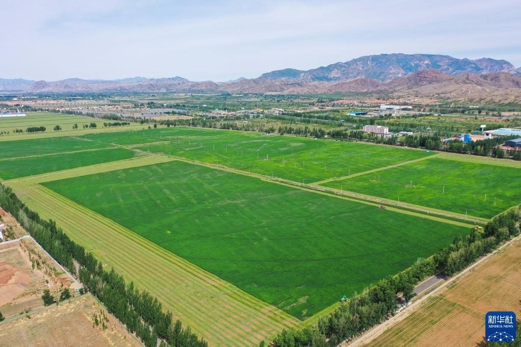這是6月4日拍攝的土默特左旗國家現(xiàn)代農(nóng)業(yè)示范區(qū)內(nèi)的苜蓿種植基地(無人機照片)。