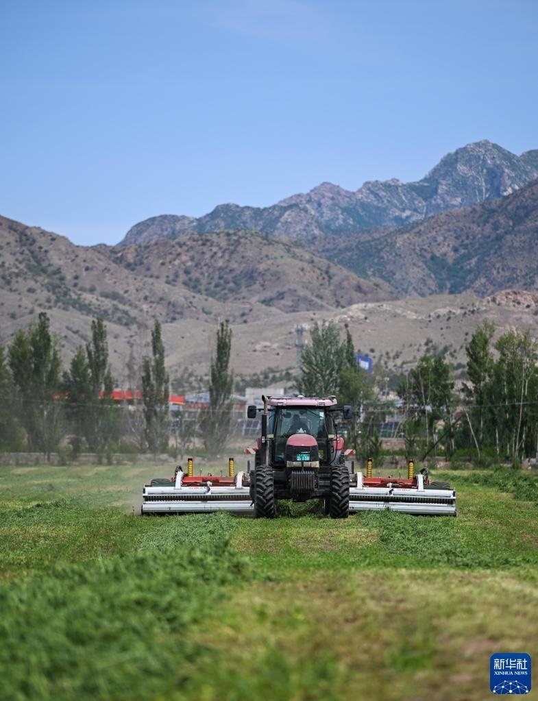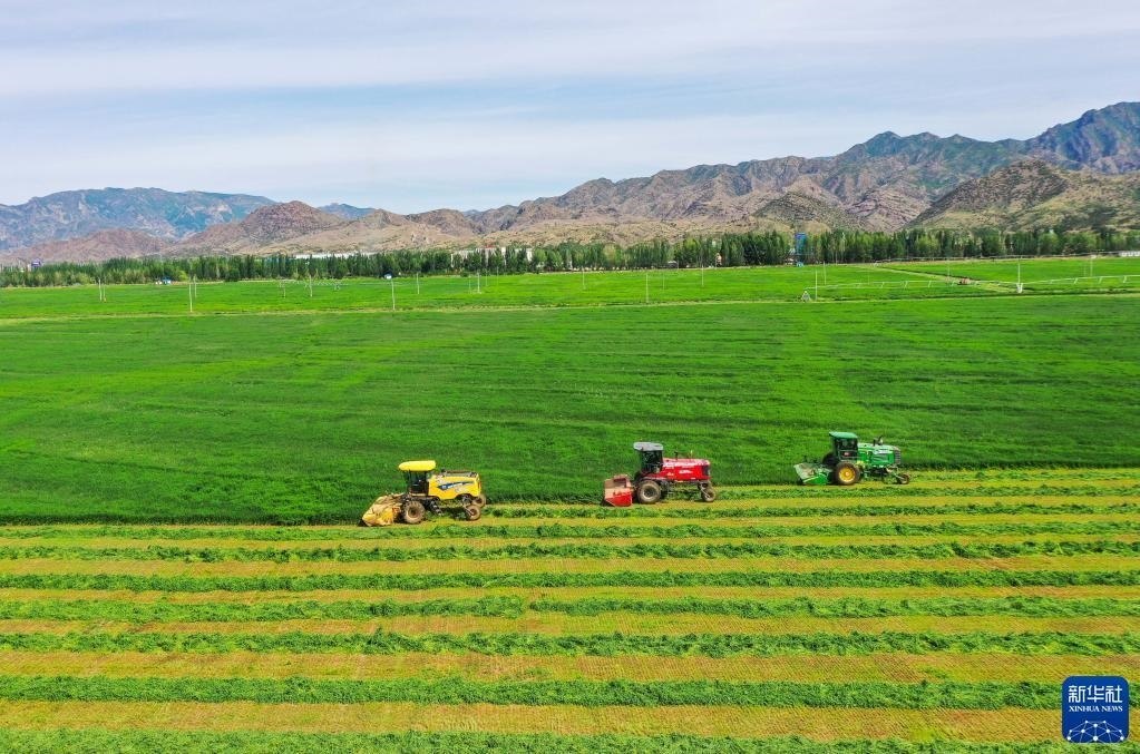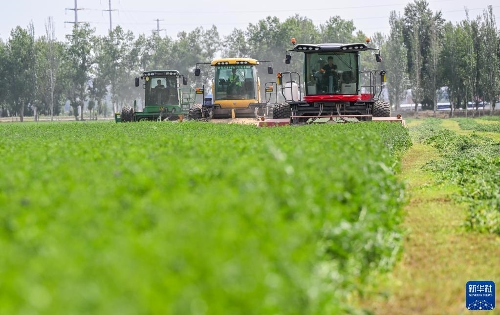 6月4日,在土默特左旗國家現(xiàn)代農(nóng)業(yè)示范區(qū)內(nèi),機械車輛在收割苜蓿。
