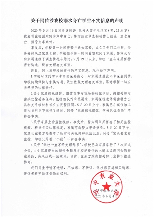 ·學(xué)生溺水身亡、不給家長看監(jiān)控視頻?華中農(nóng)業(yè)大學(xué)回應(yīng):傳言不實(shí)。