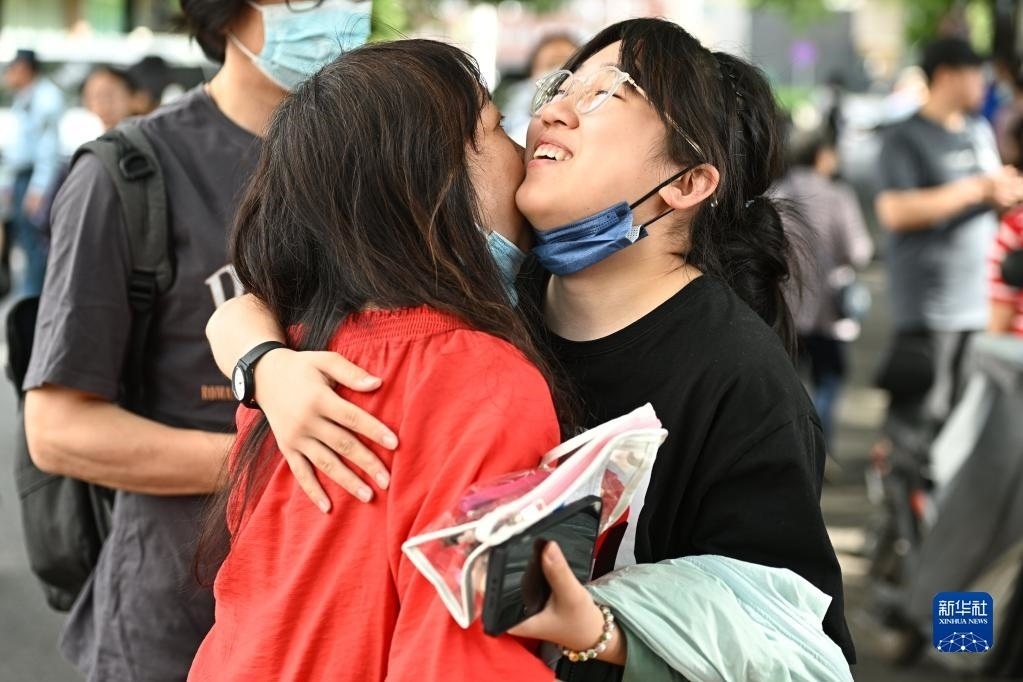 6月7日,在吉林省長春市五十六中學(xué)考點(diǎn),考生入場(chǎng)前與家長擁抱。