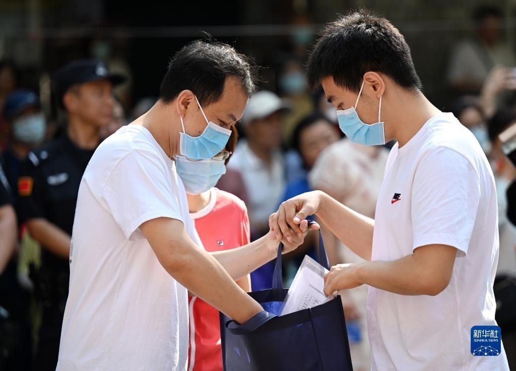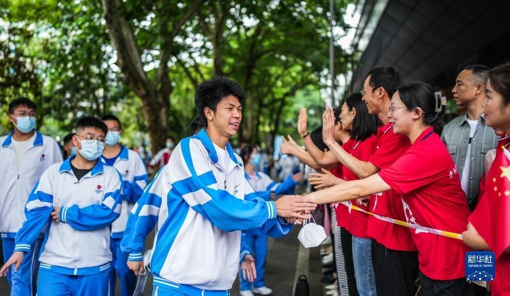 6月7日,在吉林省長春市五十六中學(xué)考點(diǎn),考生入場(chǎng)前與送考老師擊掌。