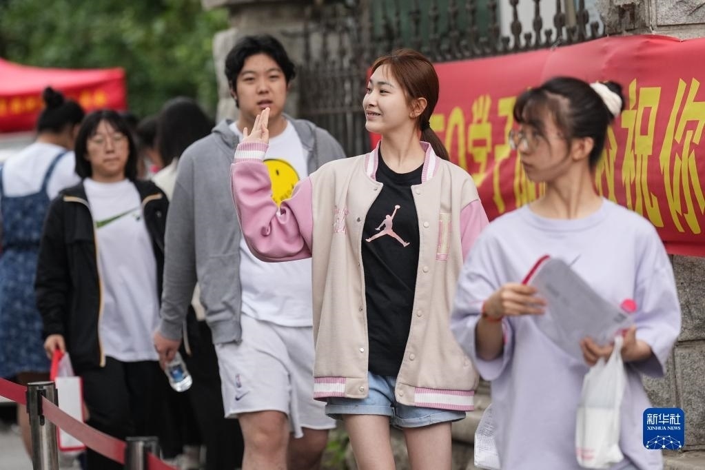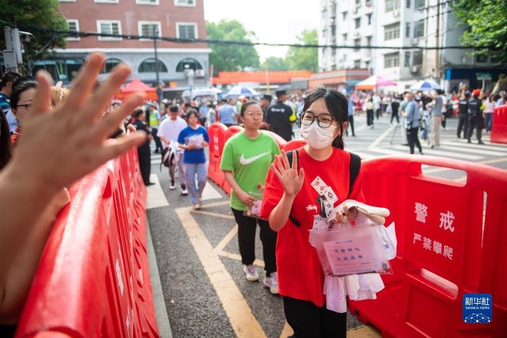 6月7日,在北京師范大學(xué)附屬實(shí)驗(yàn)中學(xué)考點(diǎn)門口,考生走進(jìn)考點(diǎn)后向家長揮手。