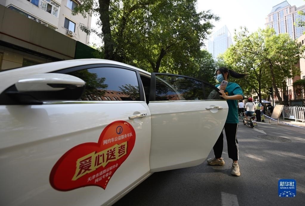 6月7日,在天津市耀華中學(xué)考點(diǎn)附近,考生從愛心送考車輛下車。