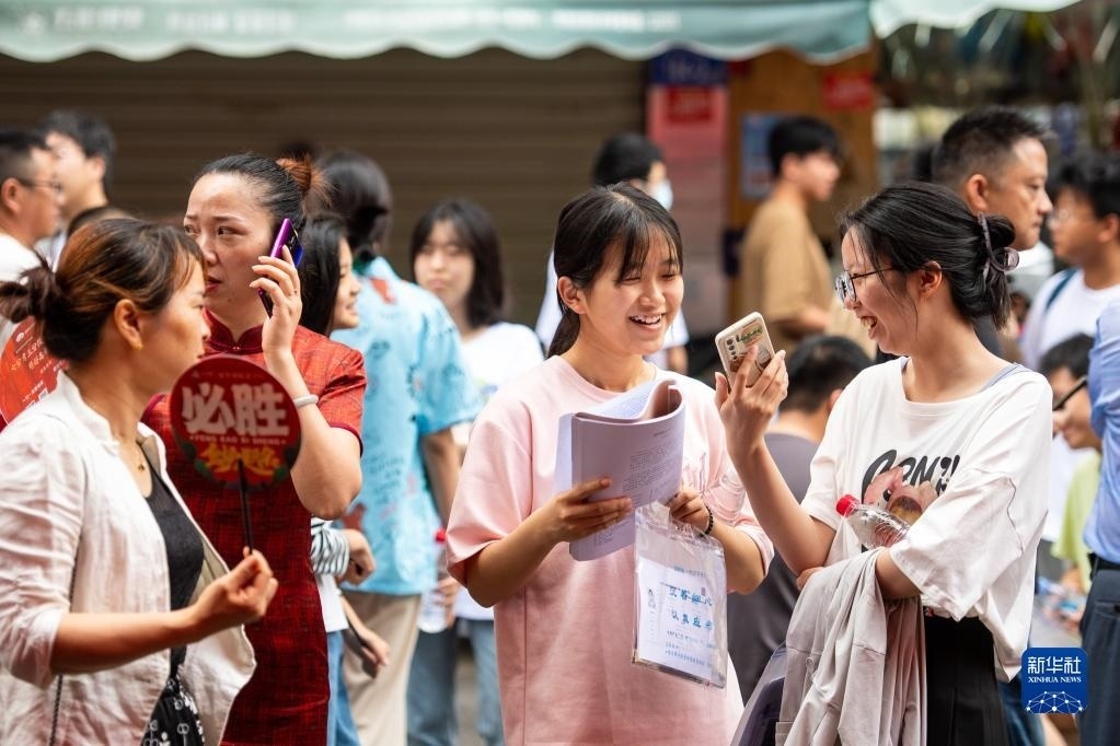 6月7日,送考老師在貴陽市烏當(dāng)中學(xué)考點(diǎn)給學(xué)生加油打氣。