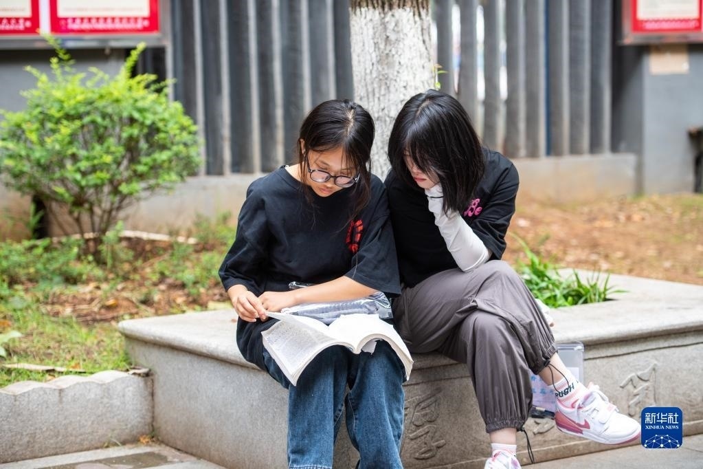 6月7日,在湖南長沙市第一中學(xué)考點(diǎn),考生在考場(chǎng)外復(fù)習(xí)。