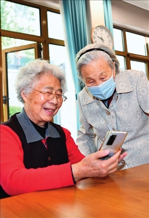 老人在位于河北三河的燕達金色年華健康養(yǎng)護中心老年活動室交談(2022年5月18日攝)。朱旭東攝/本刊