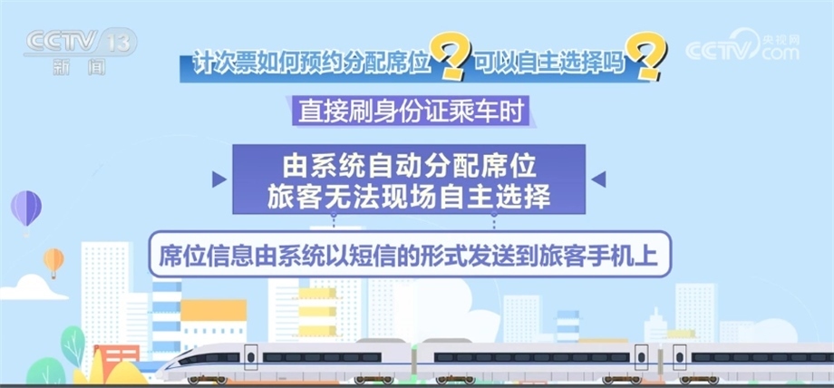 旅客提前預(yù)約時,可以根據(jù)車票銷售情況,自主選擇席位;直接刷身份證乘車時,由系統(tǒng)自動分配席位,旅客無法現(xiàn)場自主選擇。席位信息由系統(tǒng)以短信的形式發(fā)送到旅客手機上。