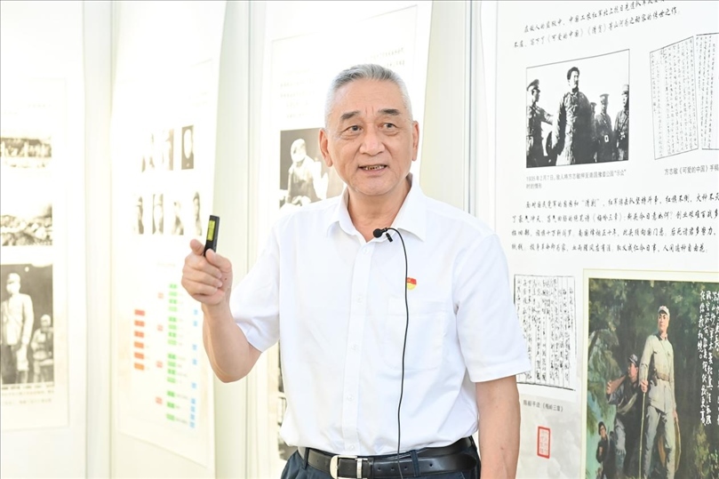 會后,領(lǐng)導(dǎo)嘉賓觀看“背負(fù)民族希望—紀(jì)念新四軍成立86周年回顧展”,張曉龍現(xiàn)場給大家講述新四軍的歷史沿革和征戰(zhàn)歷程。