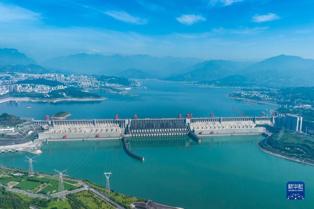 6月10日在湖北省宜昌市秭歸縣拍攝的三峽水庫水位下降后的三峽大壩(無人機(jī)照片)。