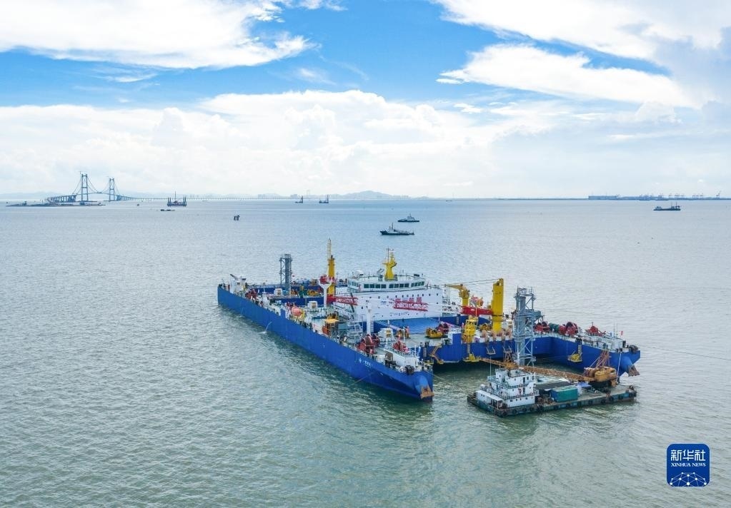 “一航津安1”號(hào)沉管運(yùn)輸安裝一體船在沉放安裝E23管節(jié)和最終接頭,背后是建設(shè)中的深中通道伶仃洋大橋(6月9日攝,無(wú)人機(jī)照片)。