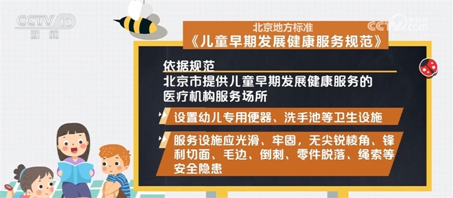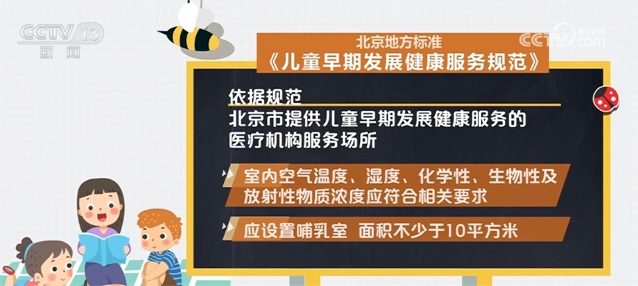 依據(jù)規(guī)范,北京市提供兒童早期發(fā)展健康服務的醫(yī)療機構服務場所應遠離各種污染源,采光充足,通風良好,遠離噪聲與電磁干擾;設置防蚊、蟲、蠅、鼠等設備,并放置于兒童無法接觸到的地方;室內(nèi)空氣溫度、濕度、化學性、生物性及放射性物質(zhì)濃度應符合相關要求。應設置哺乳室,面積不少于10平方米;設置幼兒專用便器、洗手池等衛(wèi)生設施;服務設施應光滑、牢固,無尖銳棱角、鋒利切面、毛邊、倒刺、零件脫落、繩索等安全隱患。