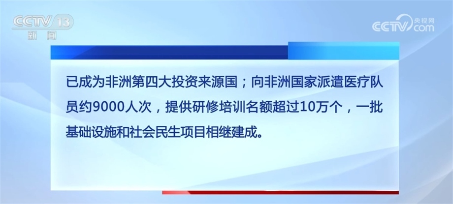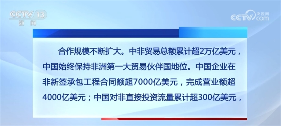 合作規(guī)模不斷擴(kuò)大。中非貿(mào)易總額累計(jì)超2萬(wàn)億美元,中國(guó)始終保持非洲第一大貿(mào)易伙伴國(guó)地位。中國(guó)企業(yè)在非新簽承包工程合同額超7000億美元,完成營(yíng)業(yè)額超4000億美元;中國(guó)對(duì)非直接投資流量累計(jì)超300億美元,已成為非洲第四大投資來(lái)源國(guó);向非洲國(guó)家派遣醫(yī)療隊(duì)員約9000人次,提供研修培訓(xùn)名額超過(guò)10萬(wàn)個(gè),一批基礎(chǔ)設(shè)施和社會(huì)民生項(xiàng)目相繼建成。