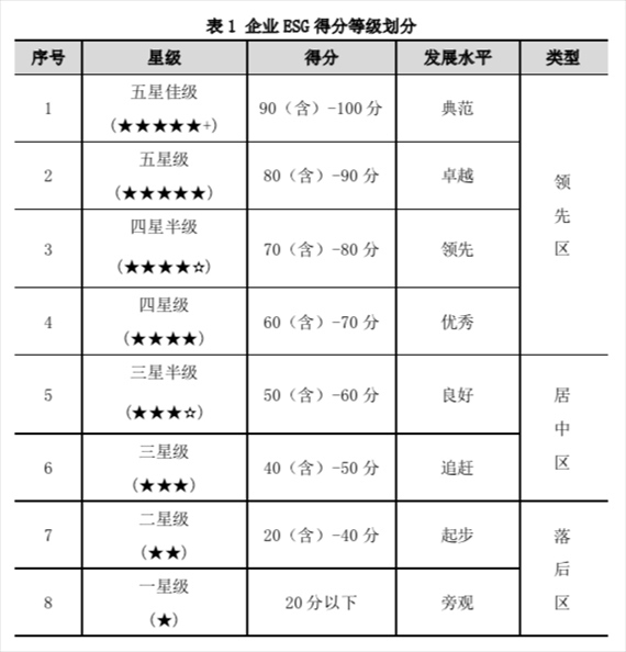 為直觀反映企業(yè)ESG水平,將ESG指數(shù)劃分為八個(gè)等級(jí),分別為:五星佳級(jí)、五星級(jí)、四星半級(jí)、四星級(jí)、三星半級(jí)、三星級(jí)、二星級(jí)和一星級(jí),各類企業(yè)對(duì)應(yīng)的星級(jí)水平和ESG發(fā)展水平見表1。