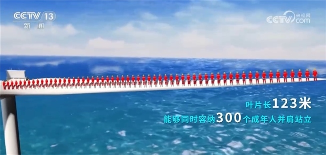 此次下線的16兆瓦風機輪轂高度達152米,相當于50層樓高。葉輪直徑252米,三架C919總長116.7米,掃風面積近7個足球場大小。葉片長123米,能夠同時容納300個成年人并肩站立。