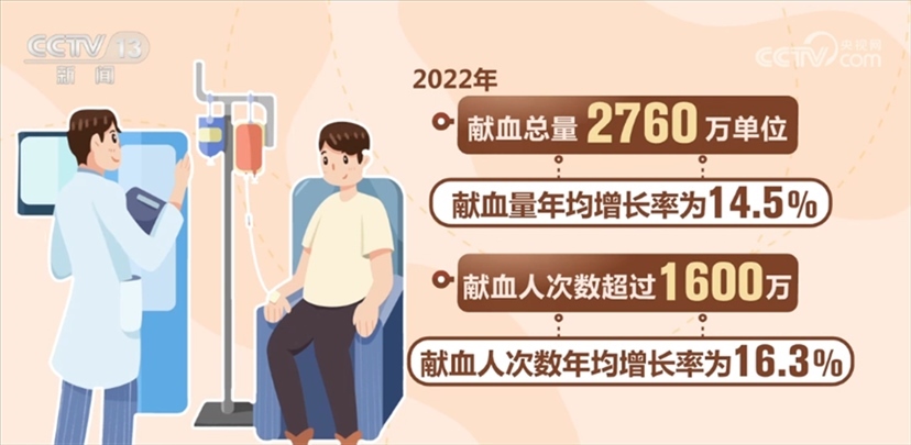 國家衛(wèi)生健康委相關(guān)負(fù)責(zé)人表示,我國無償獻(xiàn)血工作目前已形成了“政府主導(dǎo)、部門協(xié)作、社會支持、公眾參與”的格局,無償獻(xiàn)血制度全面建立,血液管理制度和規(guī)范標(biāo)準(zhǔn)體系不斷完善。全國建立了橫向到邊、縱向到底的血站采供血服務(wù)體系。全國共建設(shè)血站453家,形成以省級血液中心為龍頭、地市級中心血站為主體、中心血庫為補充的血站服務(wù)體系。我國血液安全保障水平大幅提升。全國無償獻(xiàn)血人次數(shù)和獻(xiàn)血量實現(xiàn)20多年持續(xù)增長,千人口獻(xiàn)血率由1998年的4.8提升至2022年11.5,2022年獻(xiàn)血總量2760萬單位,獻(xiàn)血量年均增長率為14.5%。2022年獻(xiàn)血人次數(shù)超過1600萬,獻(xiàn)血人次數(shù)年均增長率為16.3%。今年1—5月,獻(xiàn)血人次數(shù)和獻(xiàn)血量比去年同期增長7.7%和6%。