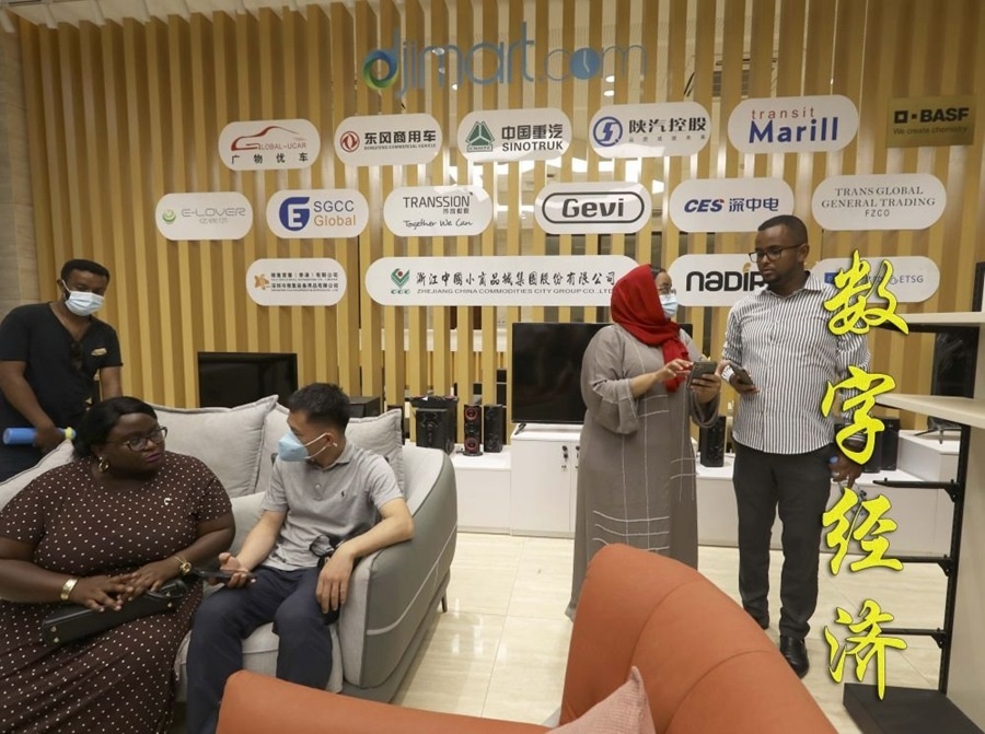 烏干達(dá)青年企業(yè)家迪莉婭(前左)在吉布提國際自貿(mào)區(qū)跨境電商平臺(tái)展示區(qū)與中方人員交流(2022年9月14日攝)。