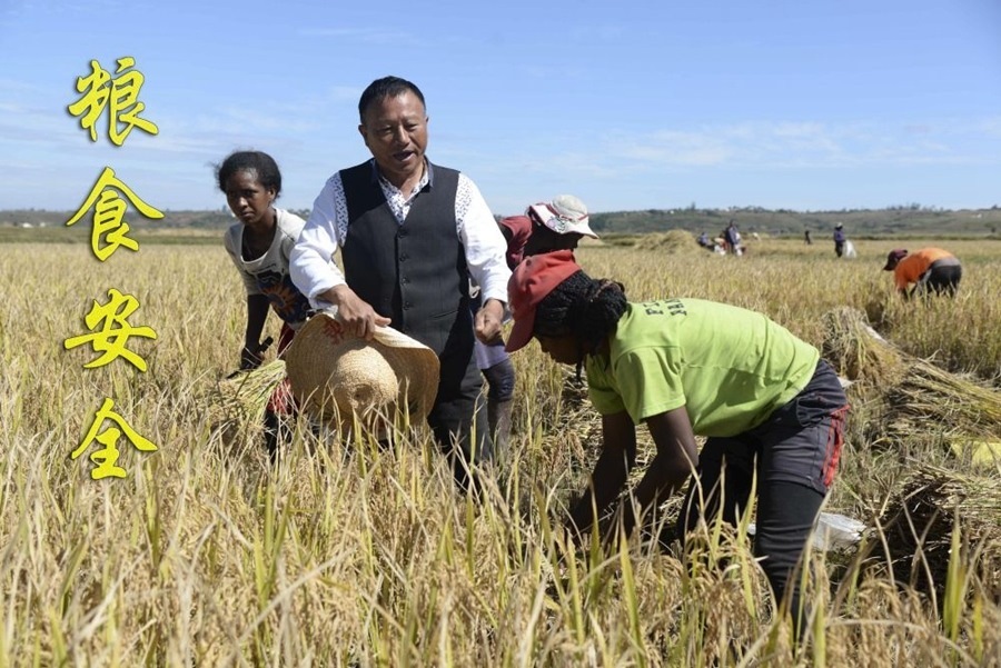 在馬達(dá)加斯加首都塔那那利佛附近的馬義奇鎮(zhèn),中國雜交水稻技術(shù)專家胡月舫(左二)在中國國家雜交水稻工程技術(shù)研究中心非洲分中心的試驗(yàn)田里和當(dāng)?shù)剞r(nóng)民交流(2023年5月12日攝)。目前,中國雜交水稻在馬達(dá)加斯加累計(jì)推廣面積已達(dá)5萬多公頃,平均每公頃產(chǎn)量可達(dá)7.5噸左右。馬達(dá)加斯加距離實(shí)現(xiàn)糧食自給自足的目標(biāo)邁近了一大步。