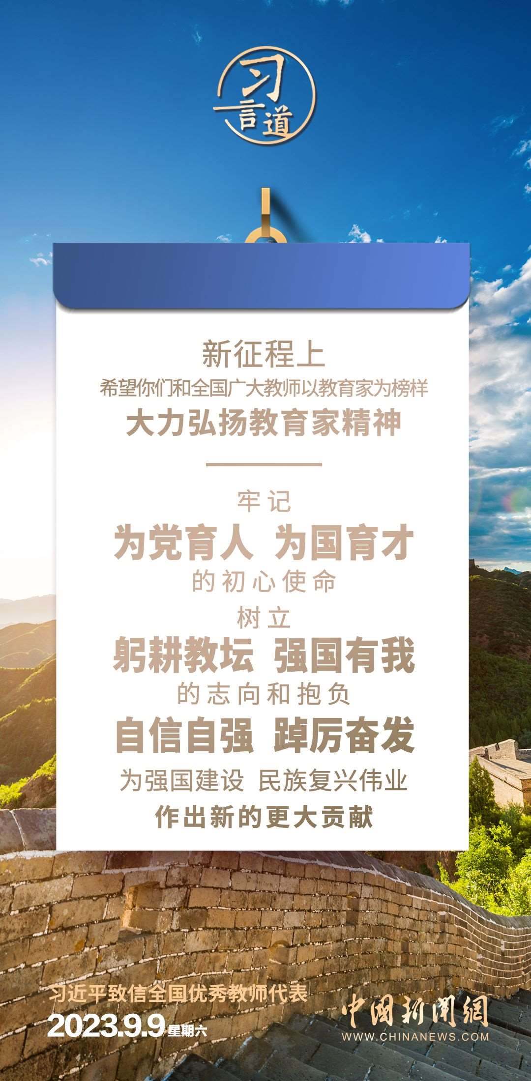 全國(guó)優(yōu)秀教師代表座談會(huì)9月9日在京召開。中共中央總書記、國(guó)家主席、中央軍委主席習(xí)近平致信與會(huì)教師代表,在第三十九個(gè)教師節(jié)到來之際,代表黨中央,向他們和全國(guó)廣大教師及教育工作者致以節(jié)日的問候和誠(chéng)摯的祝福。習(xí)近平指出——