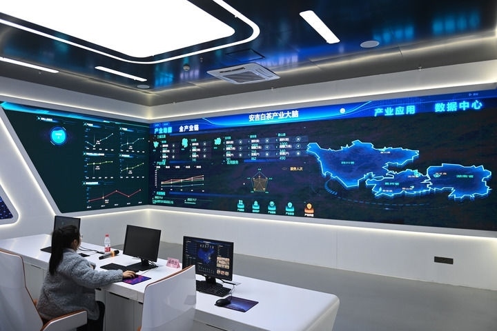 浙江安吉白茶“產(chǎn)業(yè)大腦”顯示黃杜村捐贈種植在貴州、湖南、四川等3省5縣茶苗的分布情況(2023年2月21日攝)。新華社記者 黃宗治 攝