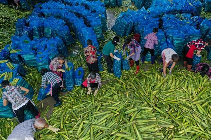 在浙江省麗水市景寧畬族自治縣大漈鄉(xiāng)大漈村茭白交易市場,村民將新收割的茭白打包冷藏(2021年8月25日攝,無人機照片)。