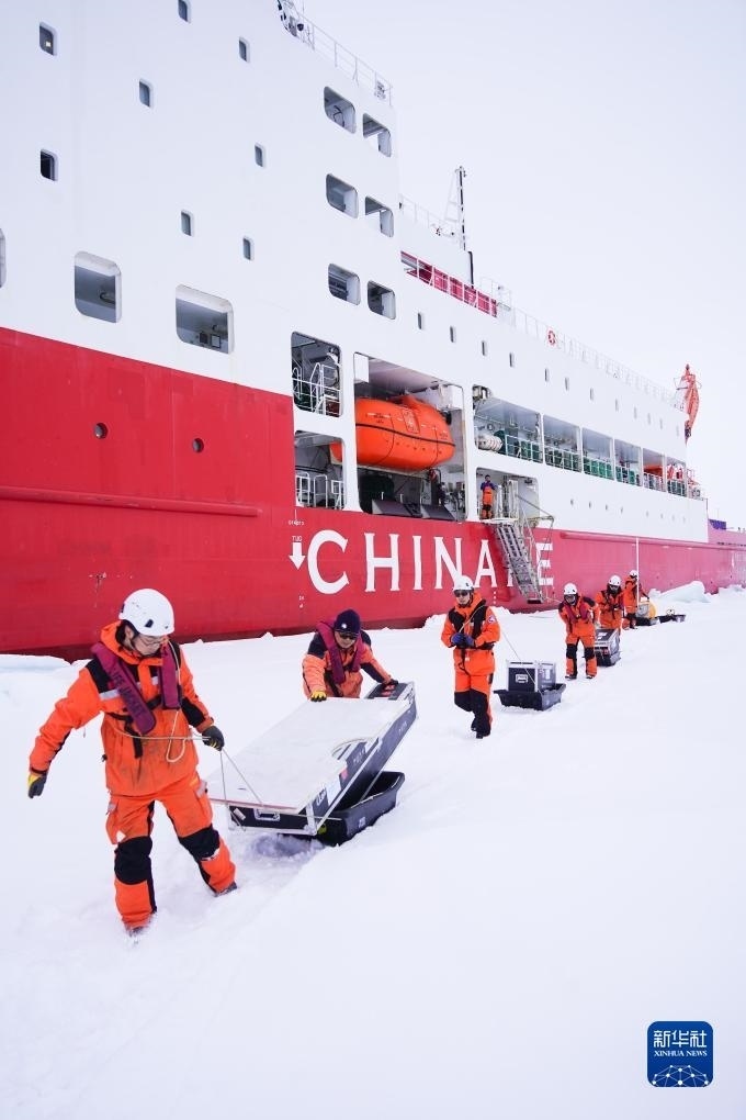北京時間5日上午10時,作業(yè)結束。上船稍事休整,考察隊全體成員下到冰面拍攝大合影。合影間隙,科考隊員三五成群,舉著臨時制作的標語橫幅,在“雪龍2”號前拍照留念。