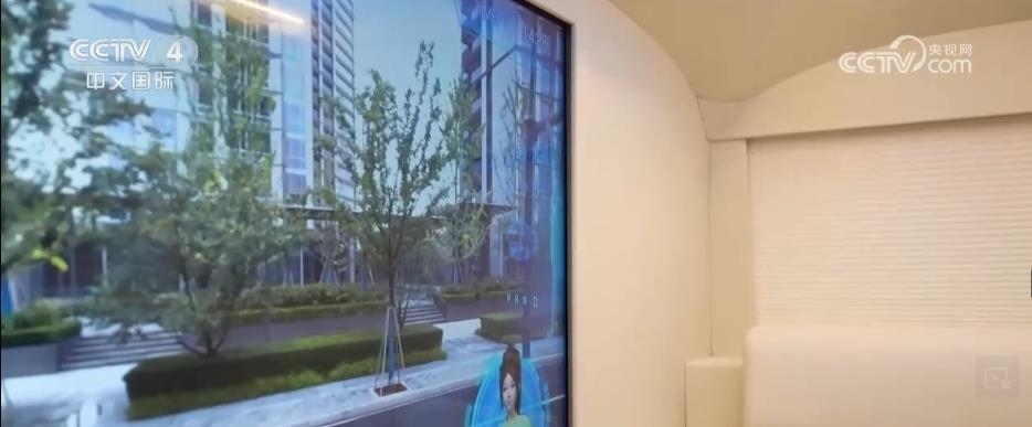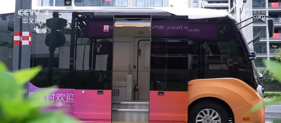 總臺記者 黃珊:亞運村里的AR智能巴士在全自動巡航狀態(tài)下,能為乘客提供接駁、講解的服務(wù)。正前方的特殊窗戶結(jié)合車載AR功能,透過它能夠看到車外的實時影像,結(jié)合虛擬場景,虛實結(jié)合,非常奇妙。