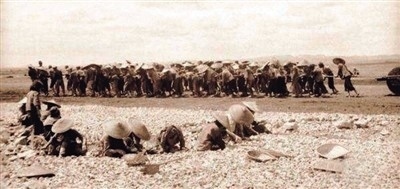△抗戰(zhàn)期間,中國民工手搬石塊、肩拉石碾修筑機(jī)場。(資料圖片)