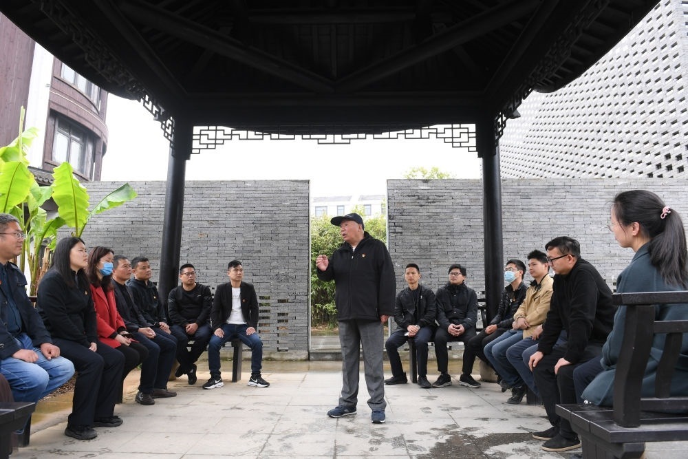 浙江紹興諸暨市楓橋鎮(zhèn)魏廉村老黨員魏杏根(中)在楓橋經驗陳列館的亭子內和年輕黨員分享當年運用“楓橋經驗”化解基層矛盾的故事(2021年4月11日攝)。