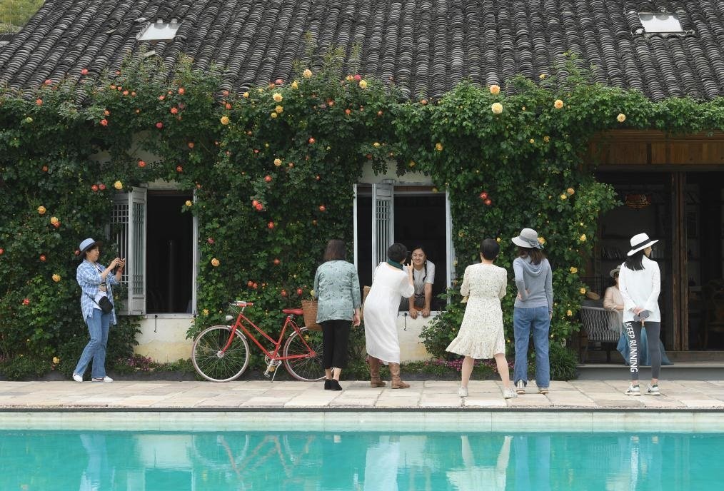 在浙江省湖州市埭溪鎮(zhèn)莫家柵村的玫瑰莊園,參觀者在玫瑰盛開(kāi)的花墻前留影(2023年4月20日攝)。新華社記者 翁忻旸 攝